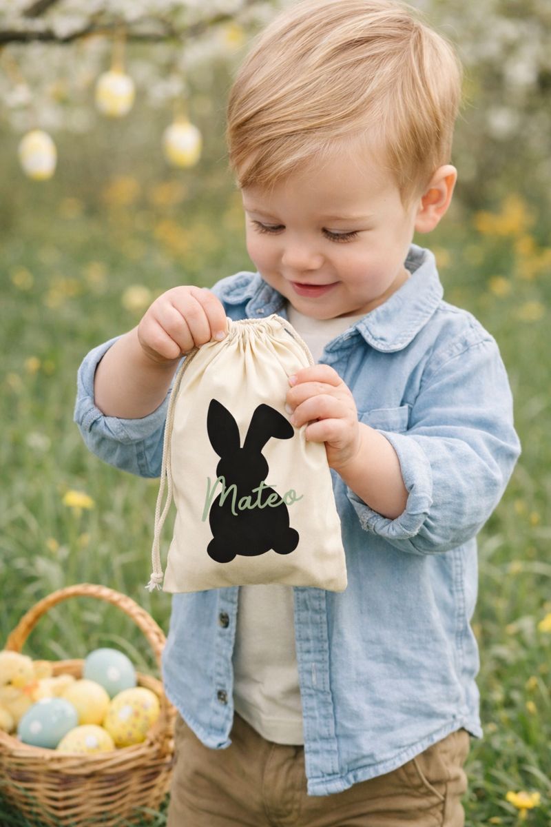 Maak Pasen nóg leuker met dit schattige canvas zakje voor paaseitjes met naam en paashaas van GiftStudio!