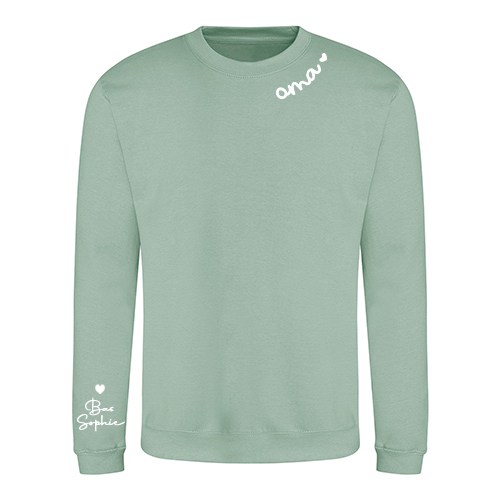 Als je meerdere namen op de sweater wilt hebben, kan je dit vermelden door middel van een komma. Deze komma’s drukken wij niet op de sweater, maar maakt het voor ons duidelijk om welke lossen namen het gaat. Boven de namen drukken wij een klein hartje.